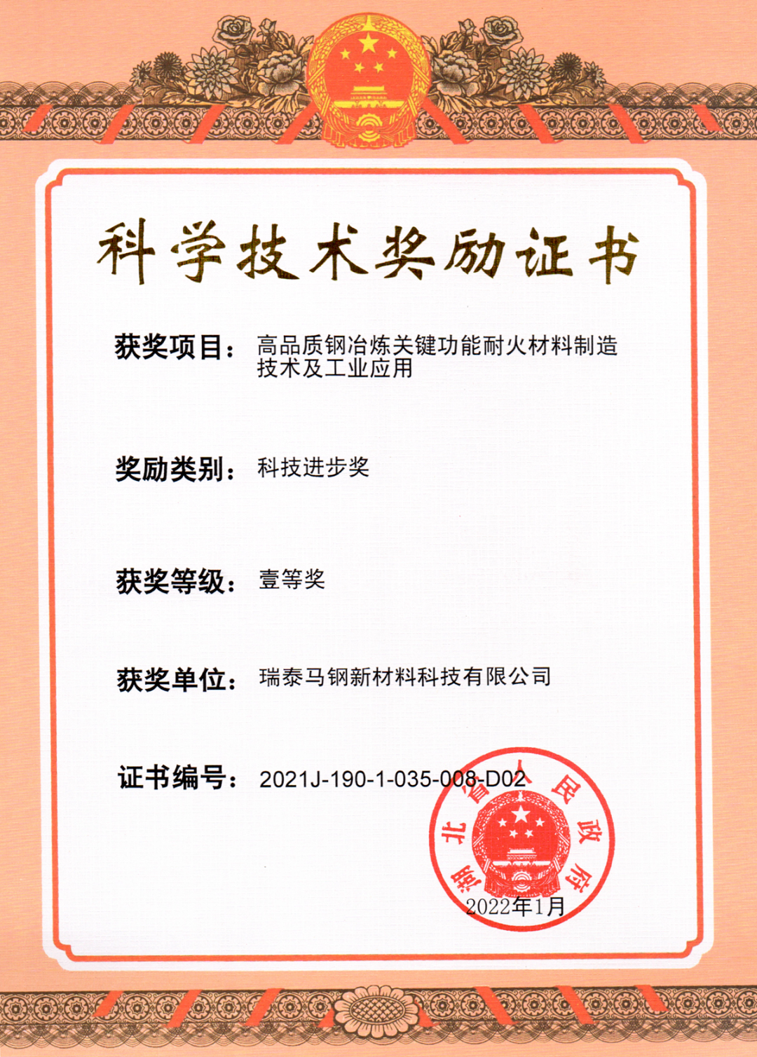 瑞泰马钢荣获湖北省科学手艺前进奖一等奖