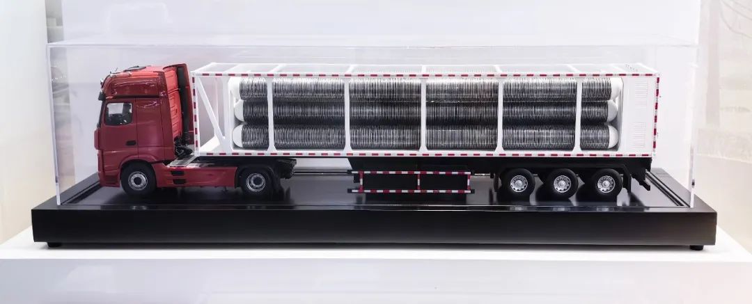 主力产品30MPa-II型管制式运氢集装箱,,,,,接纳高强度碳纤维纠葛手艺,,,,,运氢量达666kg;;;;;高压II型储氢容器组,,,,,接纳复合长管结构,,,,,事情压力90MPa,,,,,可充装氢气约118kg(3瓶组),,,,,极大提升运氢、储氢效率,,,,,为前来参展的各国气体运输厂家、加氢网络设施建设商提供了全新选择。。。。。