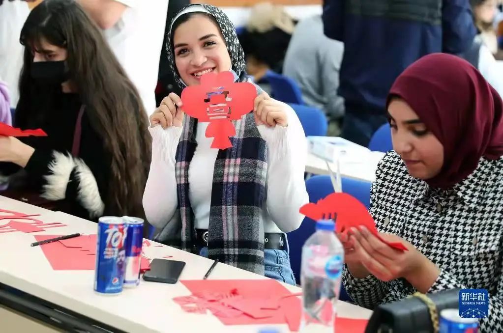 Egyptian students experience traditional Chinese paper cutting at China's fiberglass giant manufacturer Jushi in Egypt, on Dec. 30, 2021. (Xinhua/Wang Dongzhen)