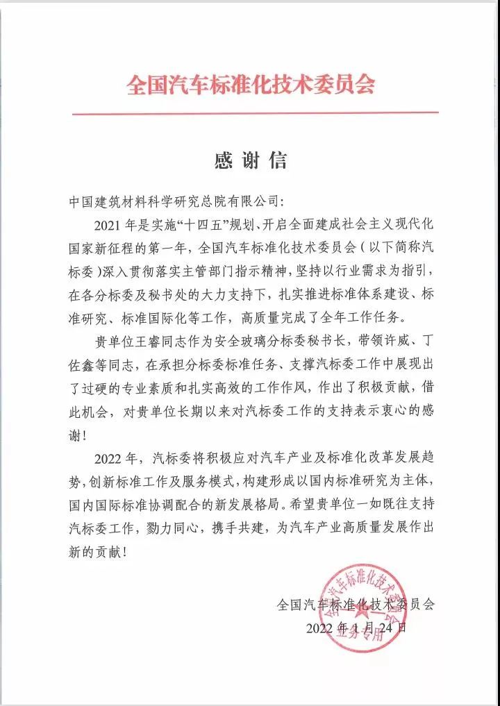 克日,,,,,天下汽车标准化手艺委员会发来谢谢信,,,,,对国检集团在肩负天下汽车标准化手艺委员会事情中做出的起劲孝顺予以谢谢和表扬,,,,,对国检集团玻璃磨练认证院王睿、许威、丁佐鑫等优异小我私家在支持全标委事情中展现出过硬的专业素质和扎实高效的事情作风予以表扬。。。。。 。