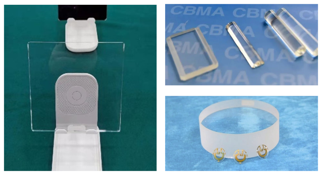 展出的光掩膜石英玻璃(左)耐辐照滤紫外石英玻璃(右上)高纯石英玻璃(右下)