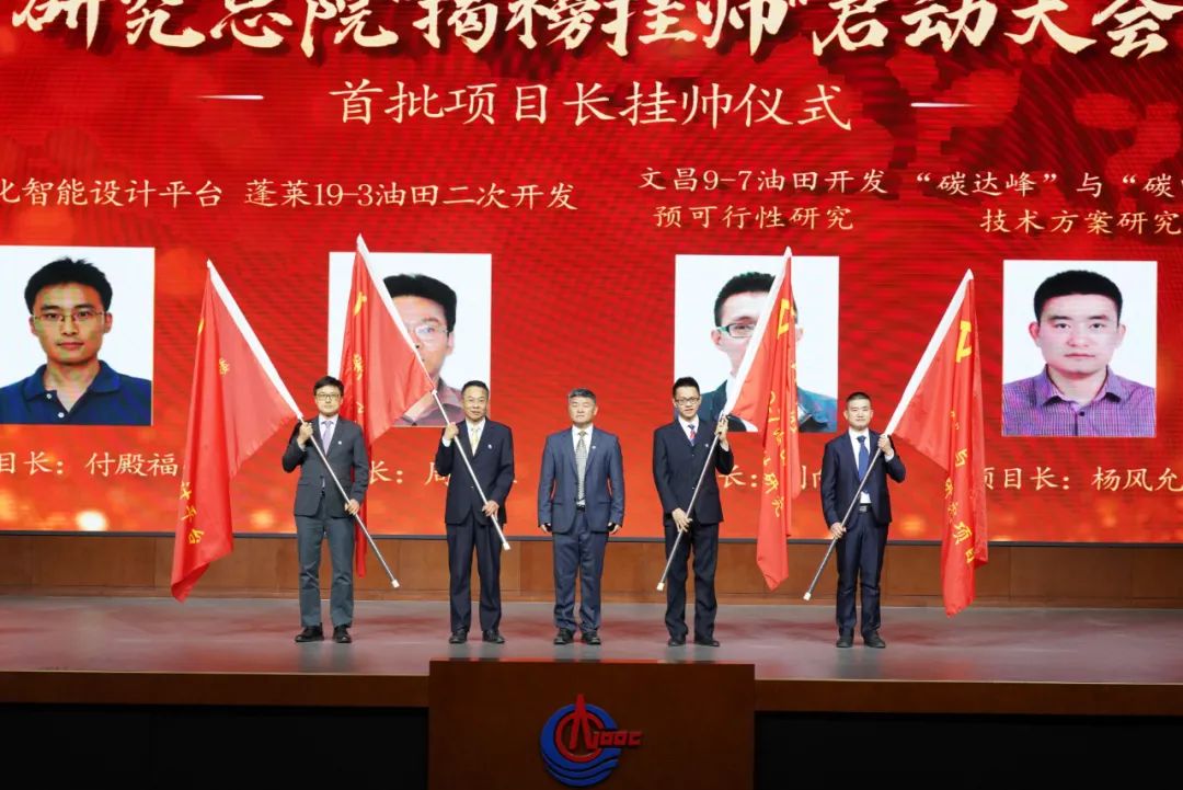 图为中国海油所属研究总院揭榜挂帅启动大会首批项目长挂帅仪式。。。。。。。。